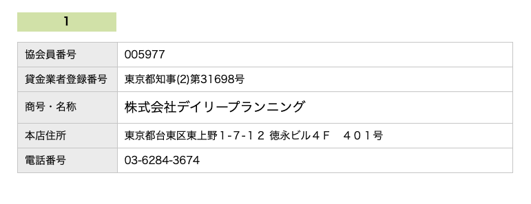上記は、公式HPに記載のものになりますが、日本賃金業協会にて会員であるか検索をすると以下のようにデイリーキャッシングはしっかりと都道府県から許可を受けている業者となっていることがわかりました。