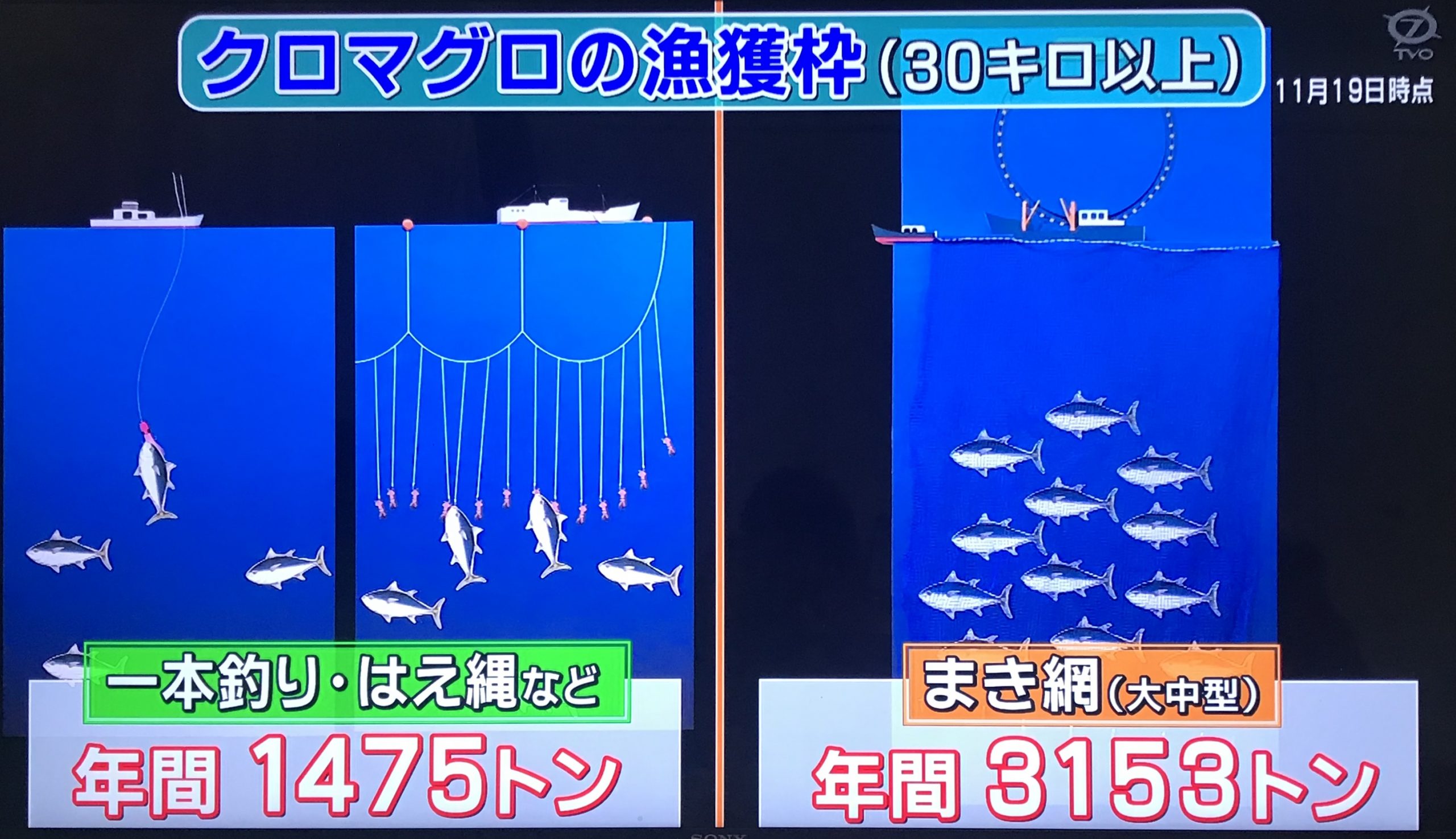 30キロ以上のマグロを捕獲する場合、「一本釣り」などには1475トン、「まき網漁」には2倍以上の3153トンの枠を振り分けた。