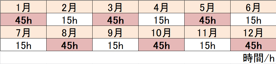 そのため、例えば1か月おきに45時間の残業をした場合、間の月は15時間で残業を終えなければない。