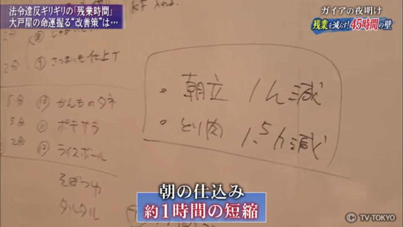 通常、2時間かかっていた朝の仕込みは、カット肉を利用したり、同時に下ごしらえをすることで、半分の時間の1時間に時短が成功した。