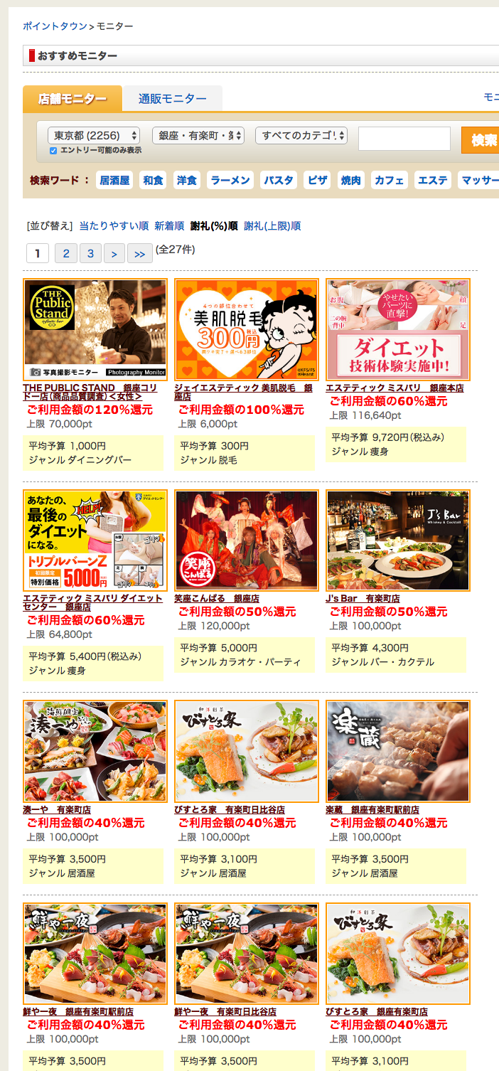 例えば以下の画像はグルメジャンルの来店調査モニターです。2名で来店して、7000円までの利用金額なら50%ポイントが還元されます。