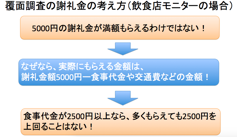 また飲食代金などモニターに掛かる費用は謝礼金額に含まれています。例えば飲食店でモニターをする例で考えます。