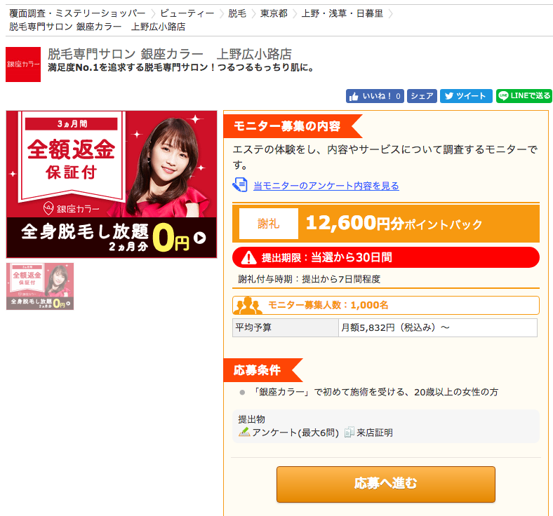 下の画面は脱毛サロンに来店すれば2ヶ月分の料金が0円になるというモニターです。提出物を見ると、アンケート項目が6件しかないので、気軽に参加できそうですね。