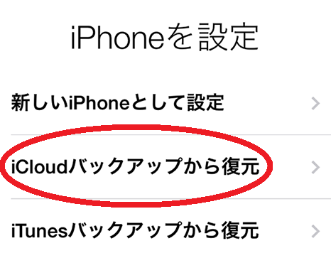 そこから上記の赤○の部分をタップして頂くとiTunesと同様にバックアップをとった日付が表示されますので、選んでから開始をするのみです。