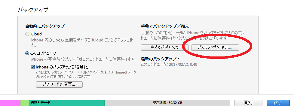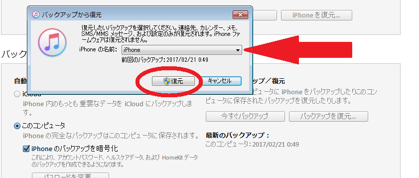 上記の赤○のをの『バックアップを復元…』をクリックします。