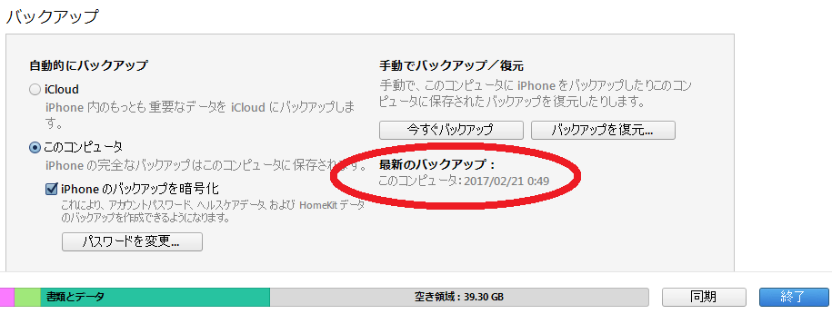 逆にここに日付、時間が表示されないようであればバックアップはとれておりません。