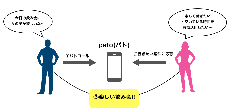 pato(パト)に登録する男性はいつでも女性を呼べ、女性は空いている時間に案件を探しお金を稼ぐ事ができます。