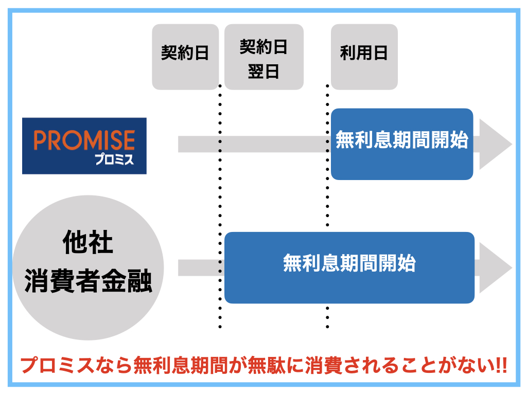 プロミスには「初回出金日の翌日から30日間」の無利息期間がありますので、契約後しばらく経ってから利用した場合、利用したその日から30日間無利息の適用が開始されます。