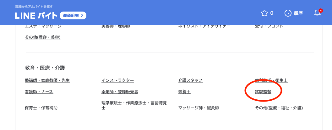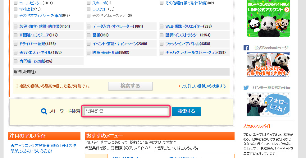 職種から探すと「試験監督」という項目がダイレクトにあります。