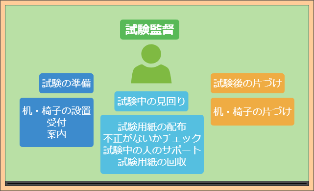 試験を監督するというと、黒板前の机に座って試験している人を監視しているようなイメージがありますが、これだけが試験監督の仕事ではありません。