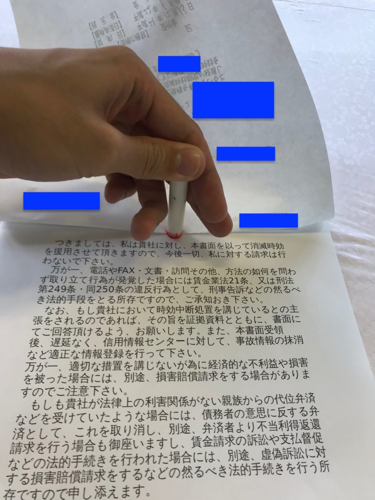 筆者に連絡する事を一切禁止する旨を記載し、もし連絡してくるなら消滅時効が不成立の証拠を出して欲しい旨を記載しました。