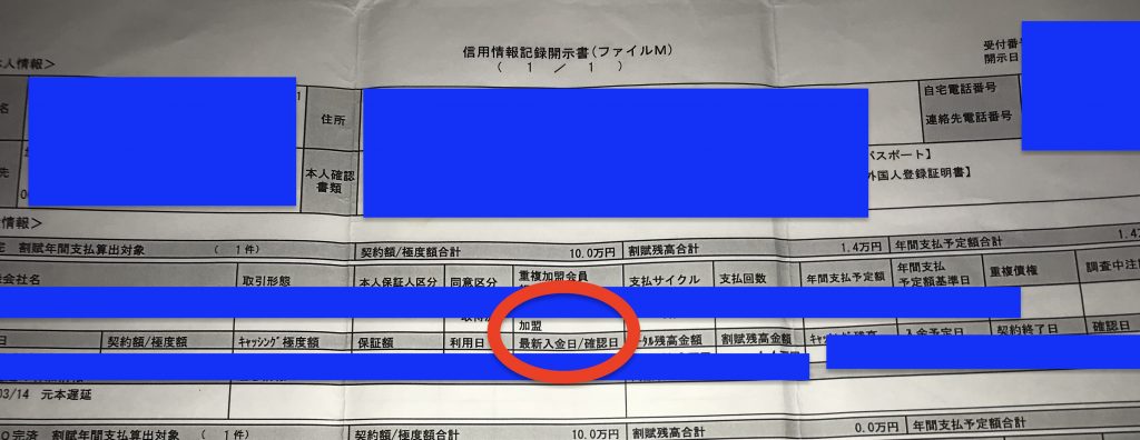 と考えていくと、自宅に届く通知でもなく、CICの情報でもなく、JICCの『最終入金日/確認日』という項目だったのです。