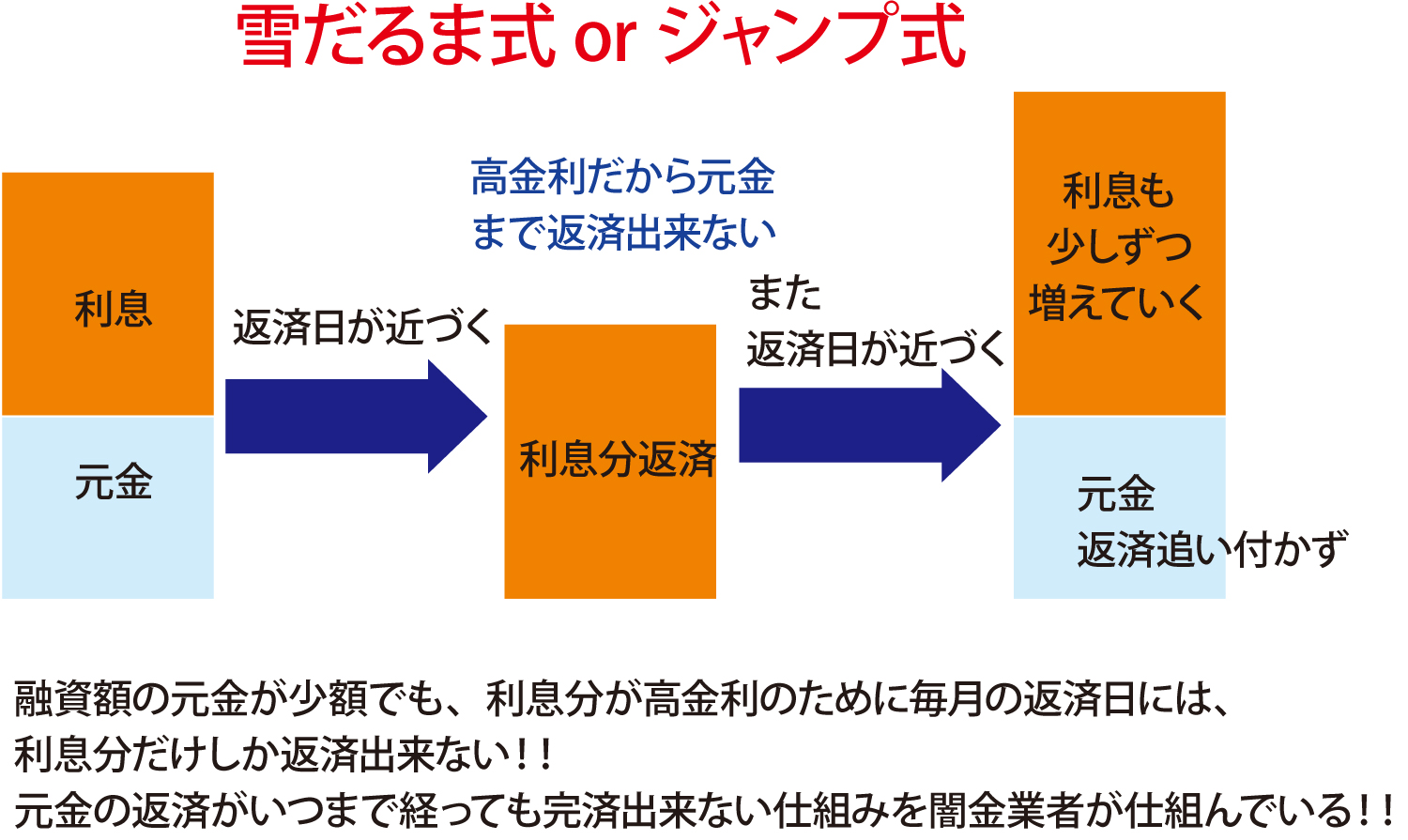 通常の金利であれば、毎月に掛かる利息分と同時に元々の元金も返済しようとしますが、高金利の為に利息分を返すだけで精いっぱいになるのです。