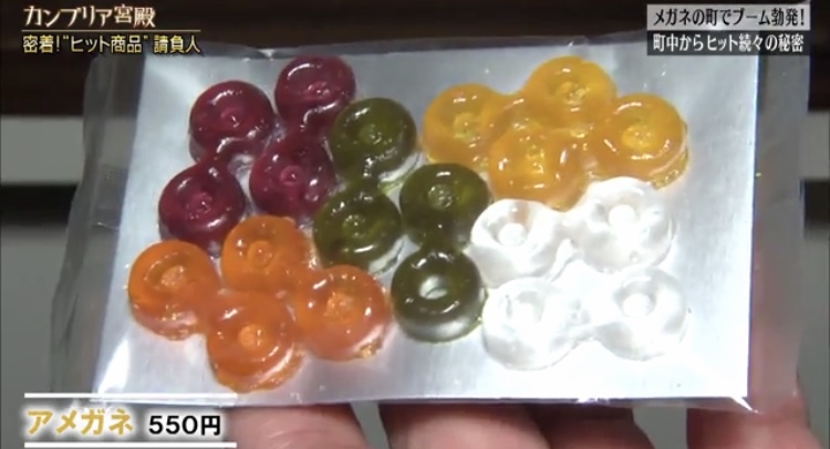 キッソオの吉川さんは眼鏡の部品を作るための小型プレス機で、地元の下請け企業に飴をプレスするというアイデアを与え、現在「アメガネ」として10個550円で販売されている。